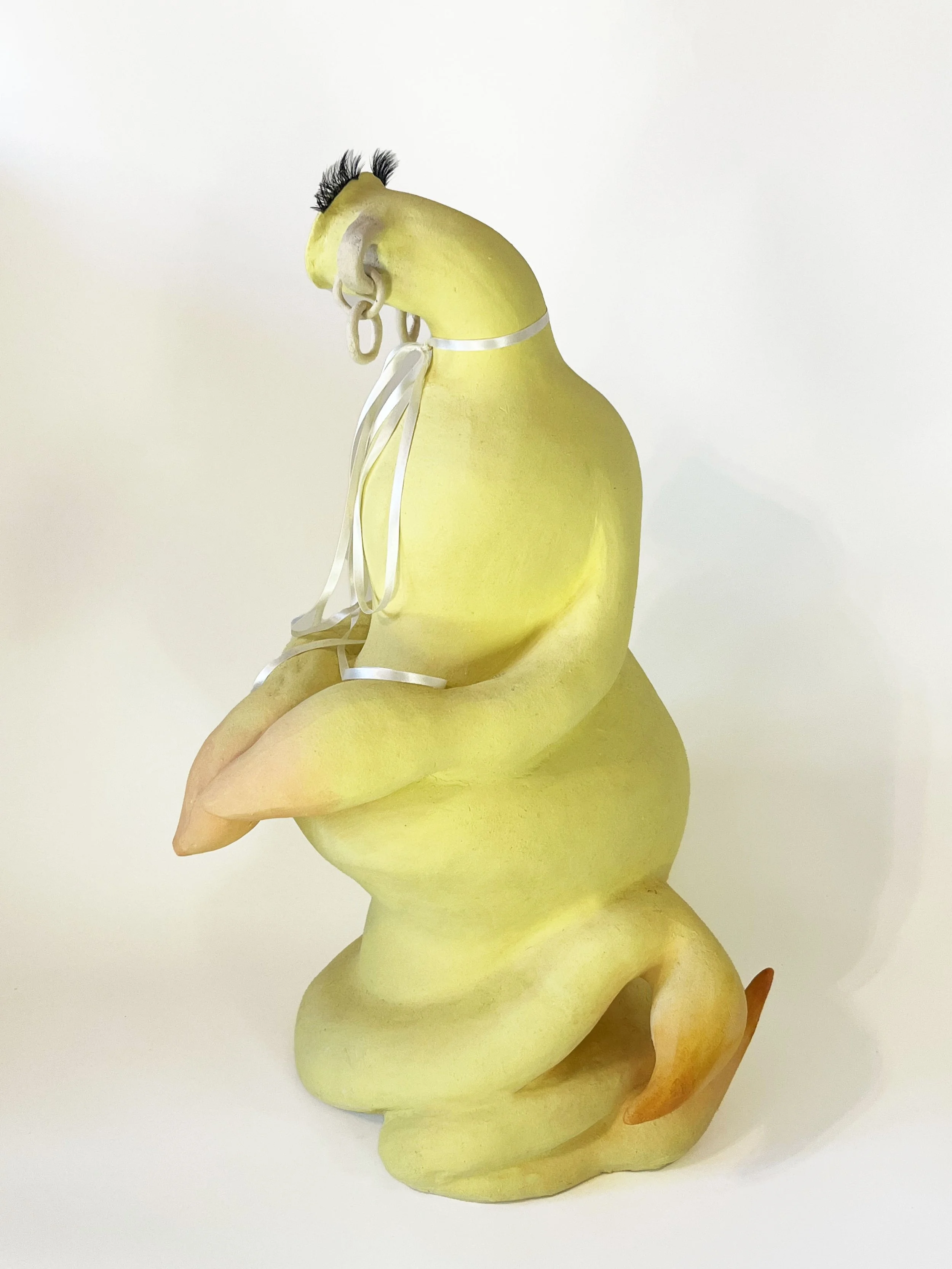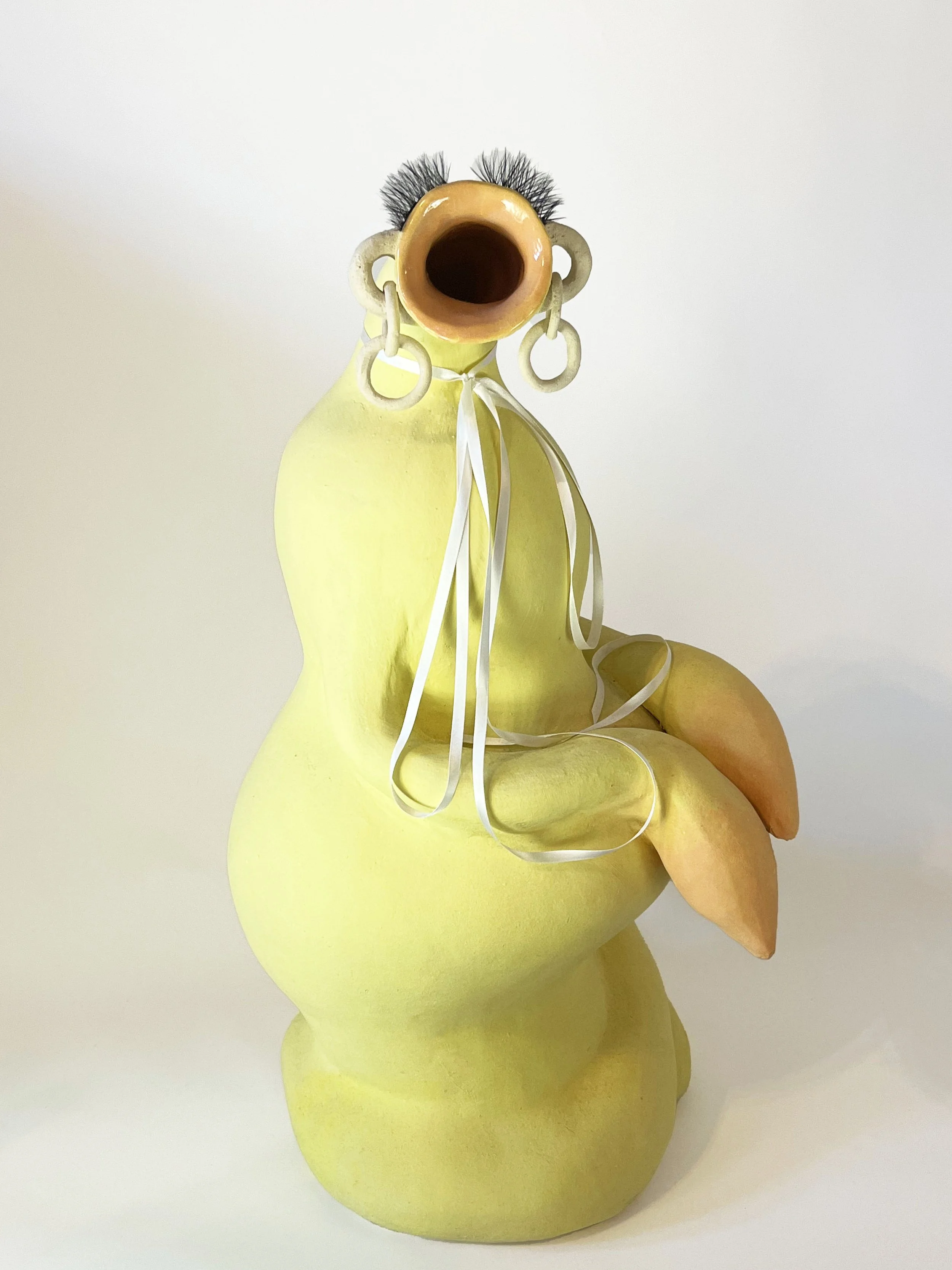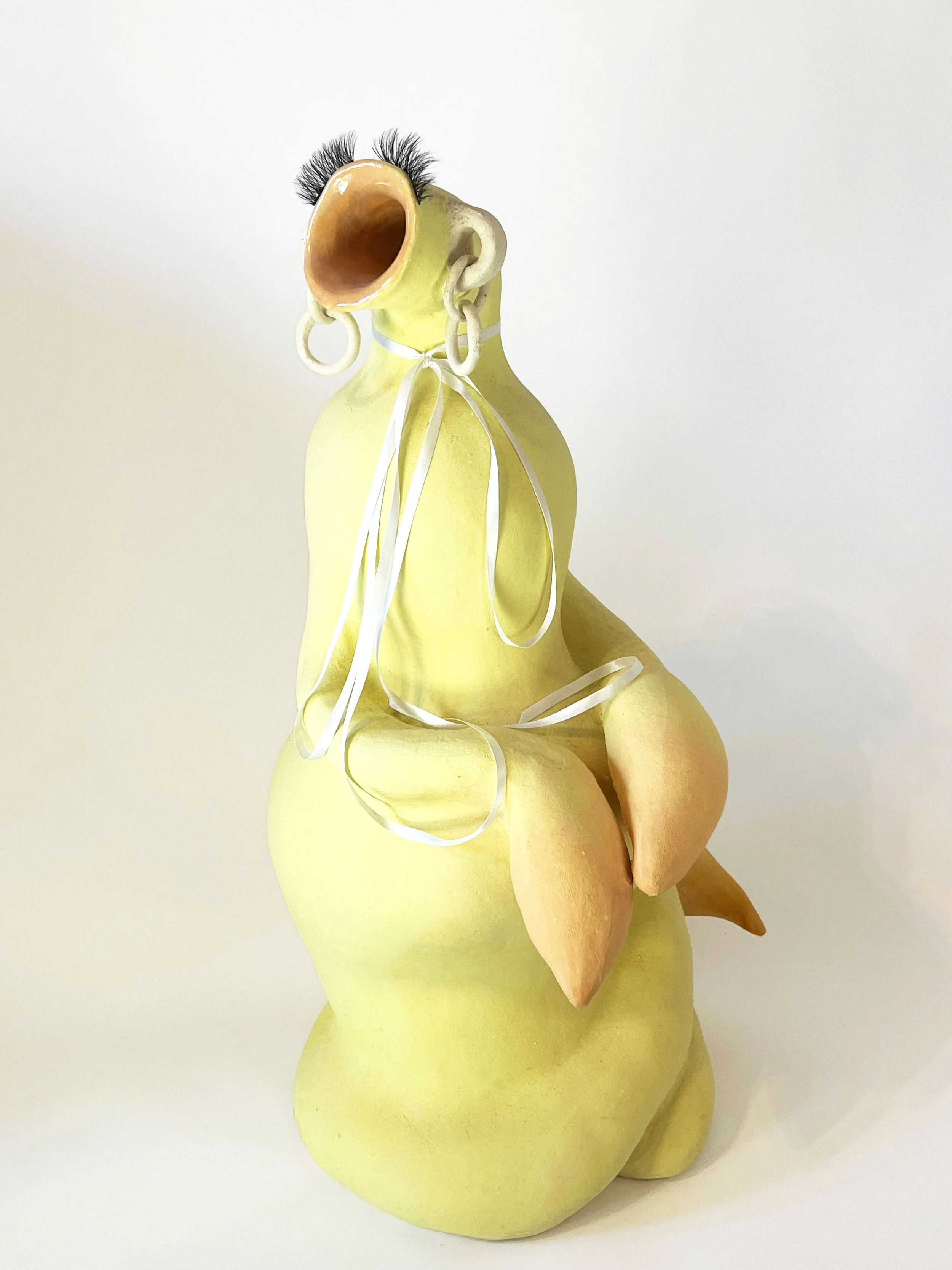 Princess Pusillanimous, 2021, ceramic, underglaze, glaze, false eyelashes, satin ribbon, 26.5 in X 13 in X 14 in
